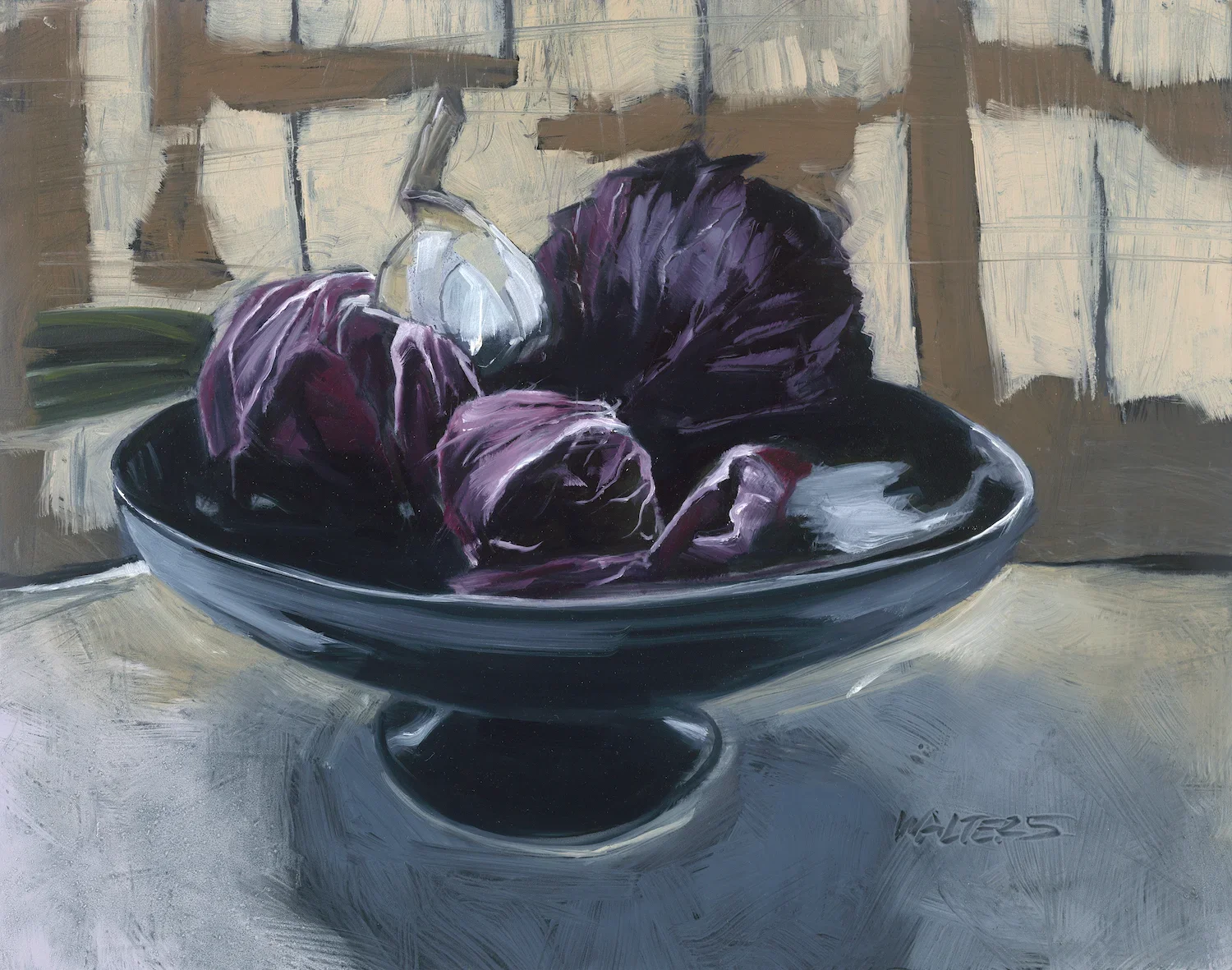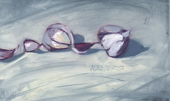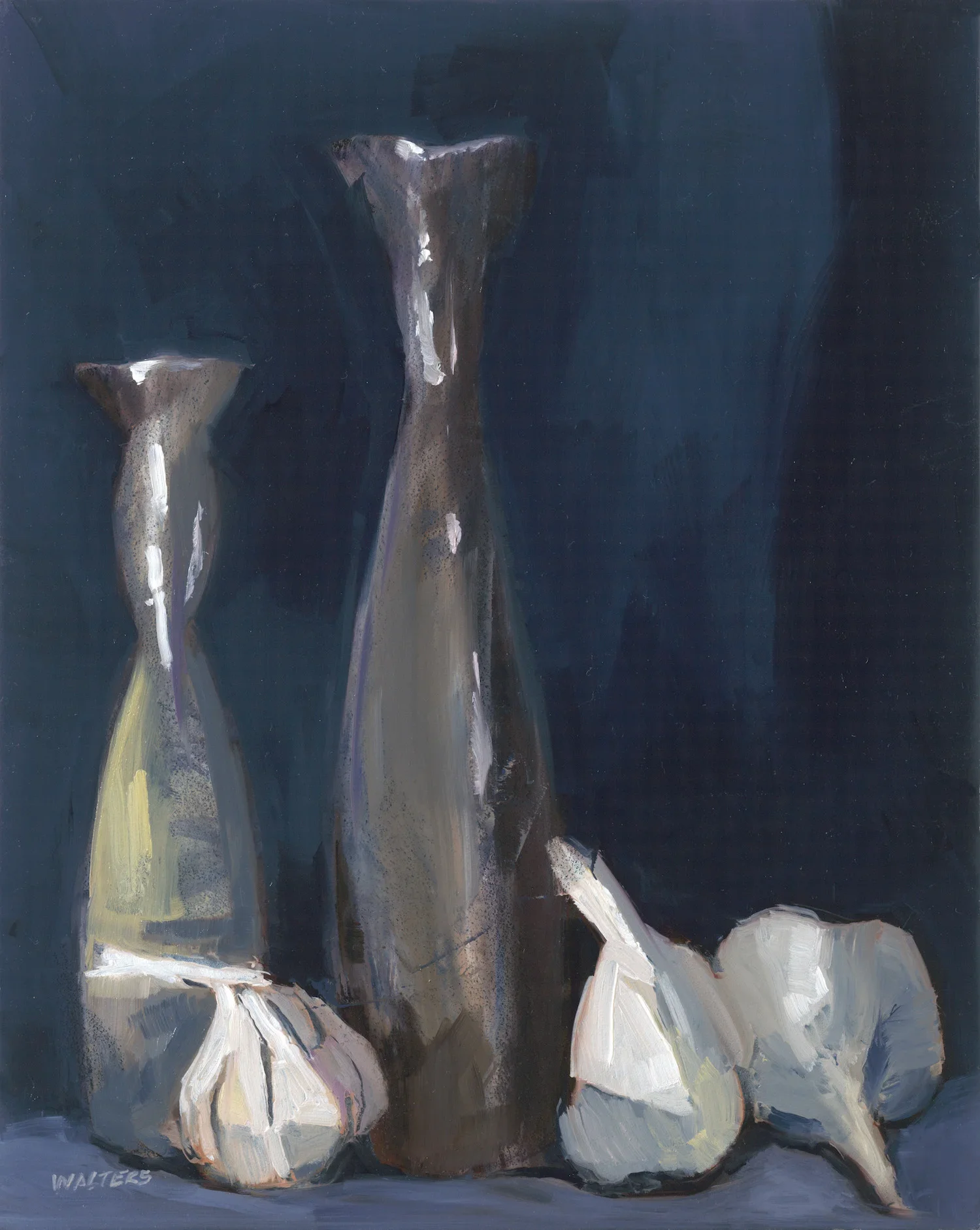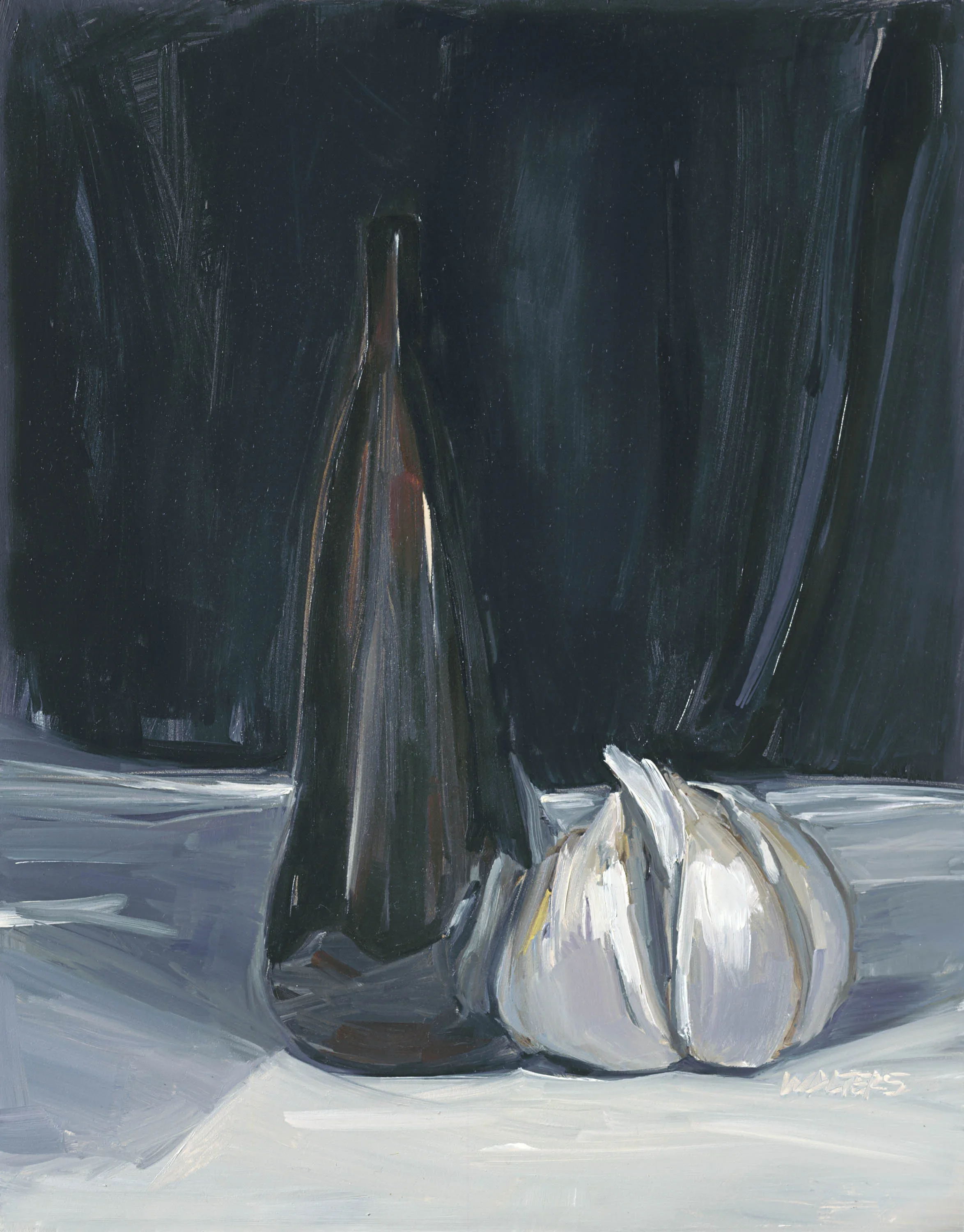 Garlic Still Life with Amber Bottle, 11 x 14 inches